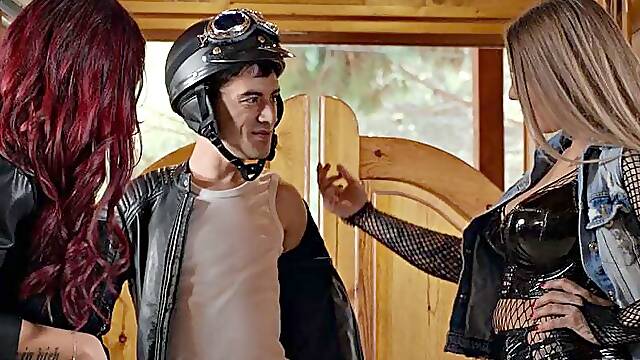 Big-titted nympho and inked babe banged in a threesome