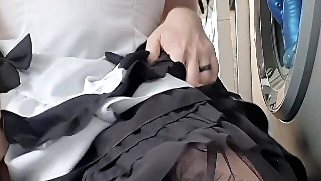 Nasty maid guy frolicking with tentacle faux-cock while doing laundry
