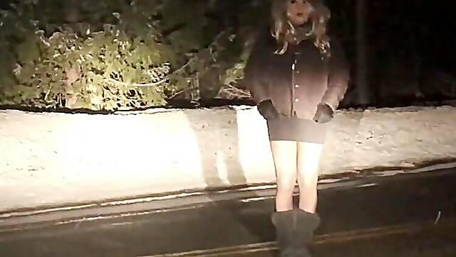 Redhead TS with huge tits gives a masked boyfriend a hot outdoor blowjob before riding him hard