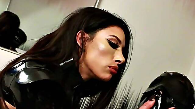 railing the sybian in a Black spandex Catsuit and Gas Mask