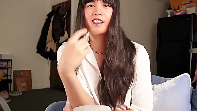 thin filipino tranny and small titties jacking her cock