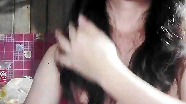 long black hair filipina shemale beauty stroking her dick