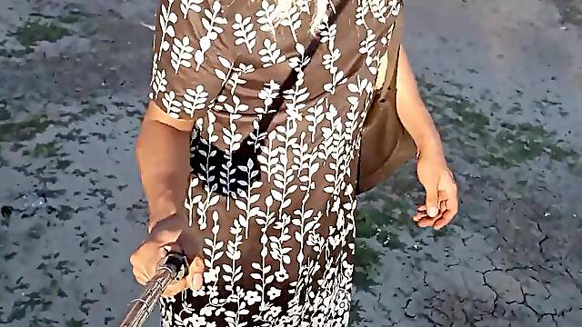 Stunning trans chick in sexy dress bangs a guys hot ass in the courtyard