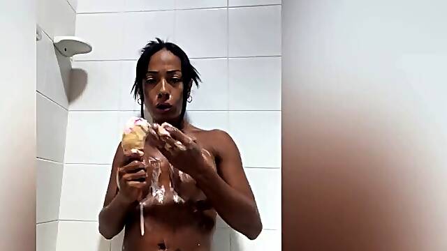 Sexy Busty Tranny And a Jock Enjoy Soapy Mutual Wanking In the Shower