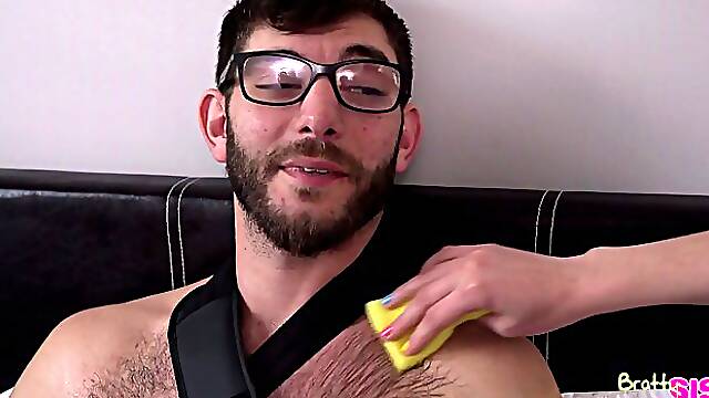 Flexible brunette is doing her stretching routine while sucking her best friend's rock hard dick
